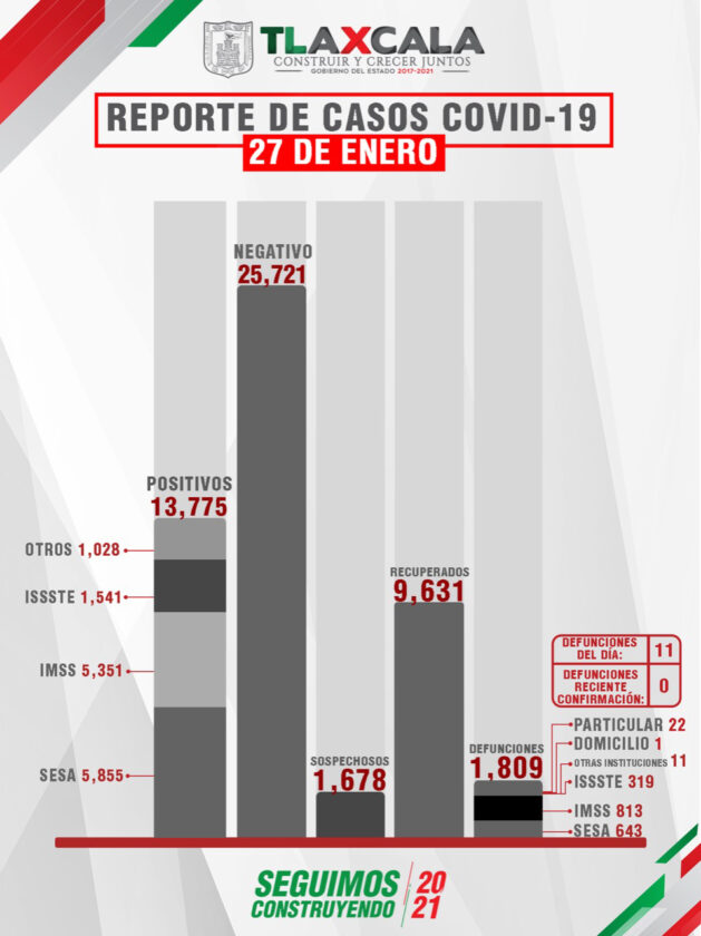 De acuerdo con el reporte del 27 de enero, la Secretaría de Salud del Estado (SESA) confirmó 57 personas recuperadas, 11 fallecimientos y 111 casos positivos de Covid-19 de tlaxcaltecas identificados en el estado y 9 en otras entidades.
