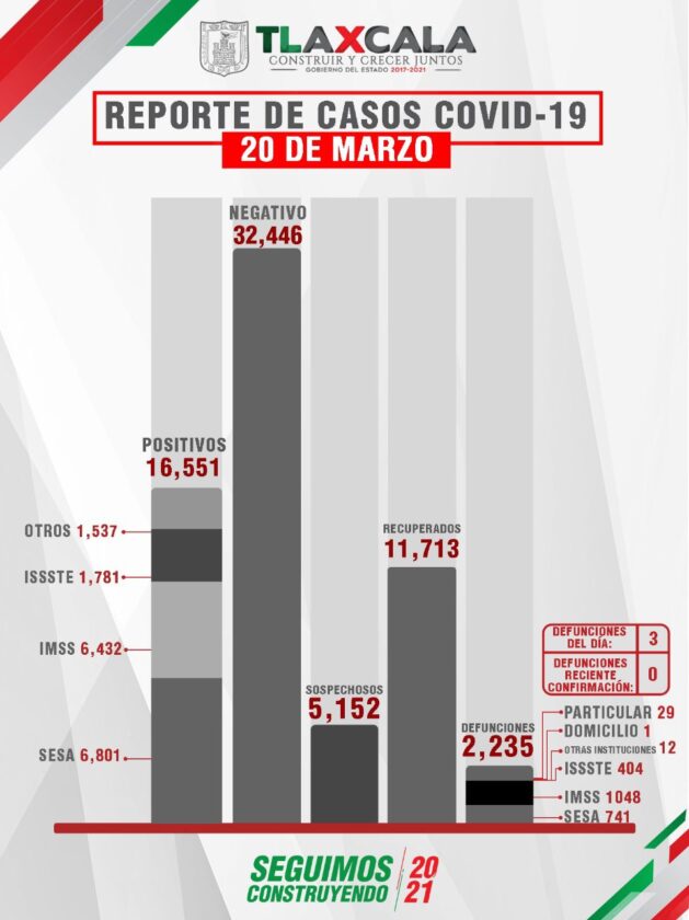 De acuerdo con el reporte del 20 de marzo, la Secretaría de Salud del Estado confirmó 17 personas recuperadas, 3 fallecimientos y 34 casos positivos de Covid-19 de tlaxcaltecas identificados en el estado.