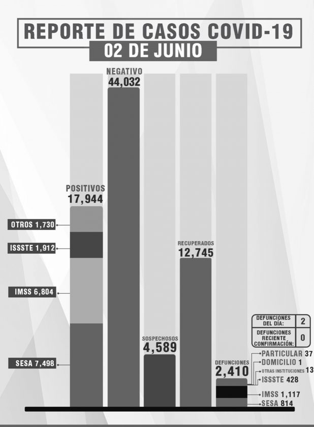 De esta manera, el estado registra 12 mil 745 personas recuperadas, 17 mil 944 casos positivos y dos mil 410 fallecimientos.
