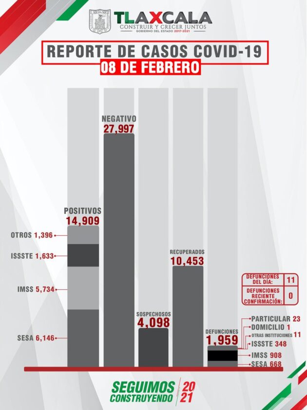 De acuerdo con el reporte del 08 de febrero, la Secretaría de Salud del Estado (SESA) confirmó 63 personas recuperadas, 11 fallecimientos y 76 casos positivos de Covid-19 de tlaxcaltecas identificados en el estado.