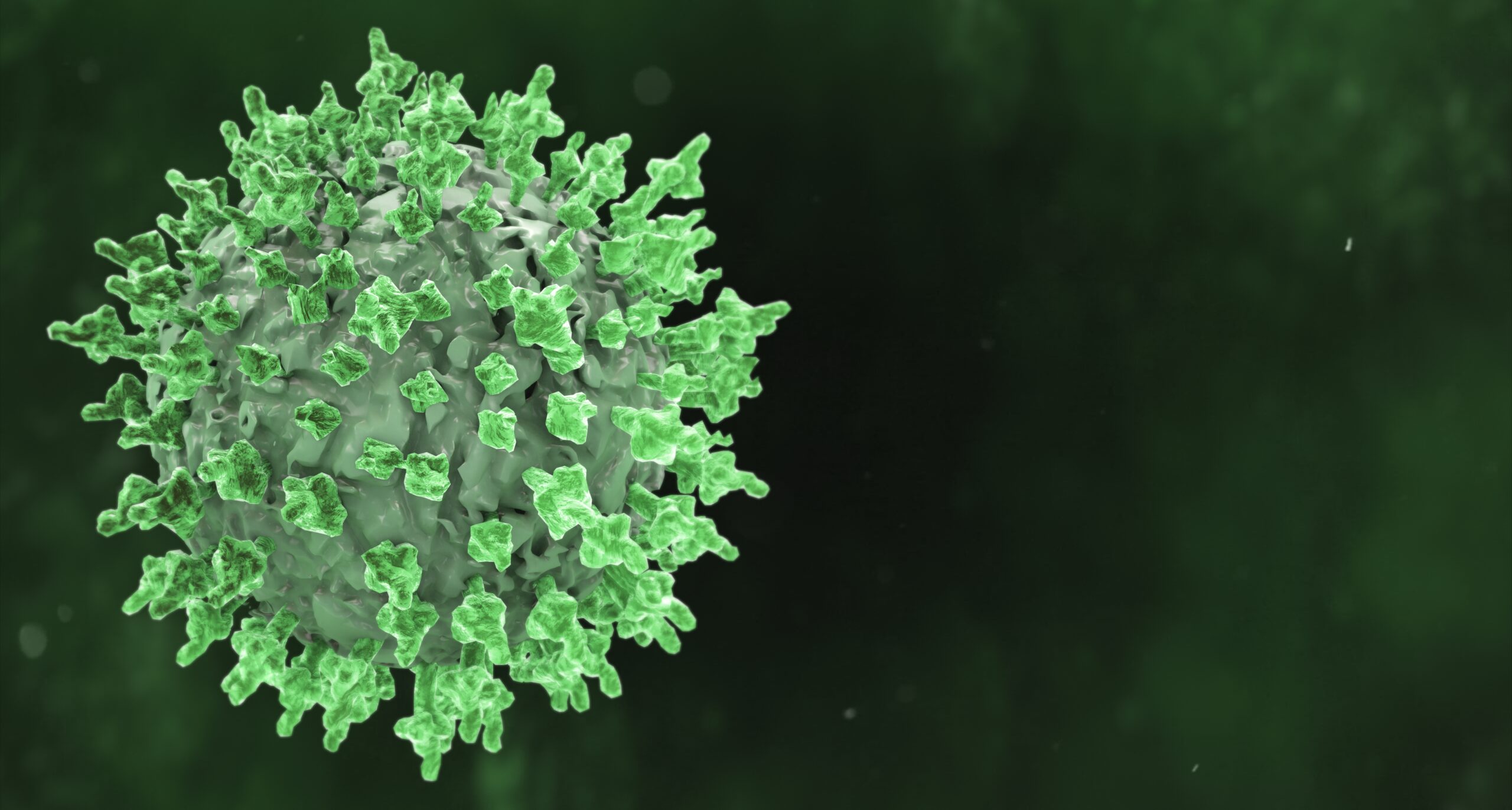 A graphic illustration of the green Coronavirus disease pandemic on a dark background