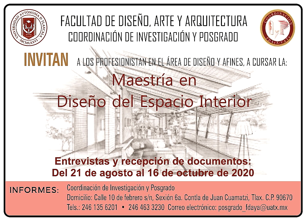 Fomentar la actualización de los conocimientos adquiridos de los egresados de las Instituciones de Educación Superior (IES) es un compromiso que se ha centrado como prioridad, por lo que, la Facultad de Diseño, Arte y Arquitectura de la Universidad Autónoma de Tlaxcala (UATx), a través de su Coordinación de Investigación y Posgrado, emitió la convocatoria de ingreso a la Maestría en Diseño del Espacio Interior, la cual dará inicio en el mes de enero de 2021.