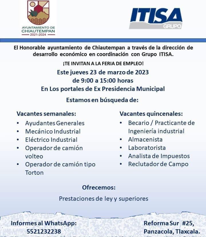 Grupo ITISA informó que cuenta con vacantes semanales y quincenales para practicantes de ingeniería, además de ayudantes generales, mecánico industrial, eléctrico industrial, operador de camión, almacenista, laboratorista, analista de impuestos, operador tipo torton y reclutador de campo.