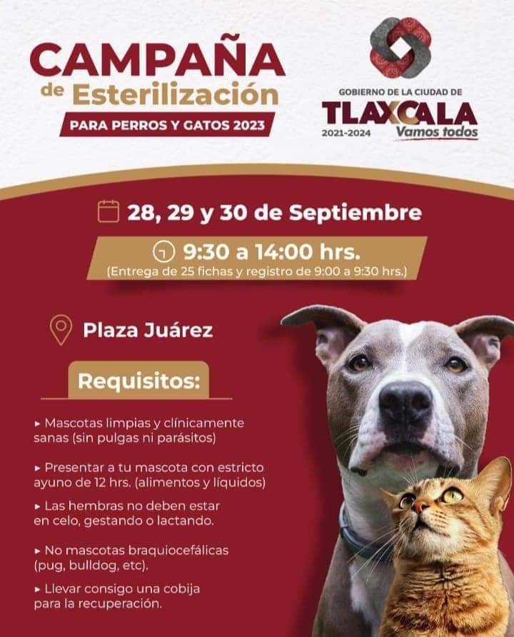 Debido a la alta demanda ciudadana el Ayuntamiento de Tlaxcala informa que los días jueves 28, viernes 29 y sábado 30 de septiembre, habrá campaña de esterilización gratuita de perros y gatos, en la Plaza Juárez de la ciudad capital.