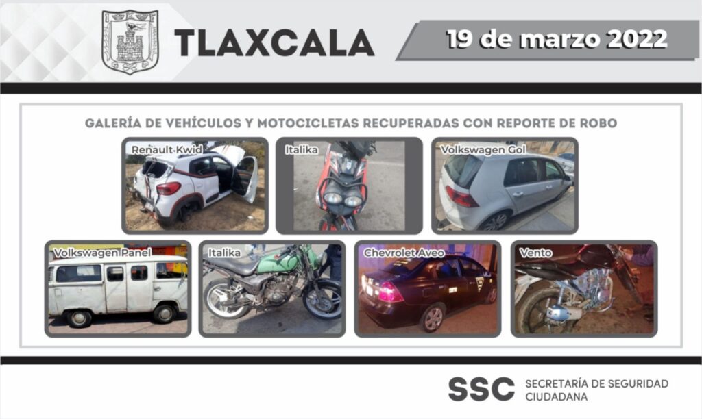 Como resultado de las acciones implementadas para combatir el robo de vehículos en el estado de Tlaxcala, la Secretaría de Seguridad Ciudadana (SSC) aseguró el día viernes un total de siete vehículos que cuentan con reporte de robo vigente y alteraciones en sus medios de identificación.