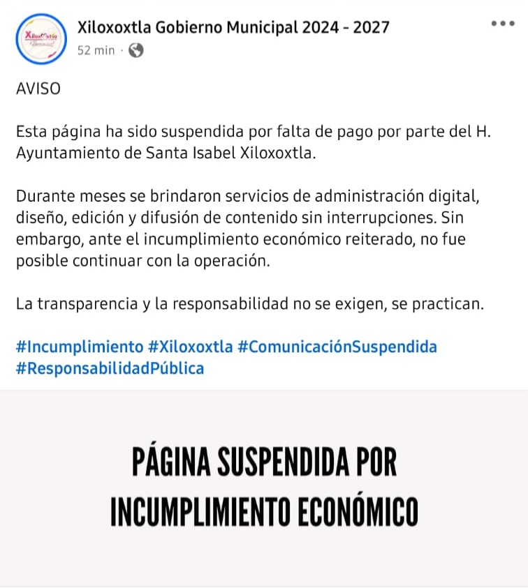 La administración de Yazmín Jiménez Rugerio quedó exhibida por su falta de seriedad y compromiso financiero, luego que la página oficial de Facebook del Ayuntamiento de Xiloxoxtla, utilizada para comunicar acciones del gobierno municipal, fue suspendida.