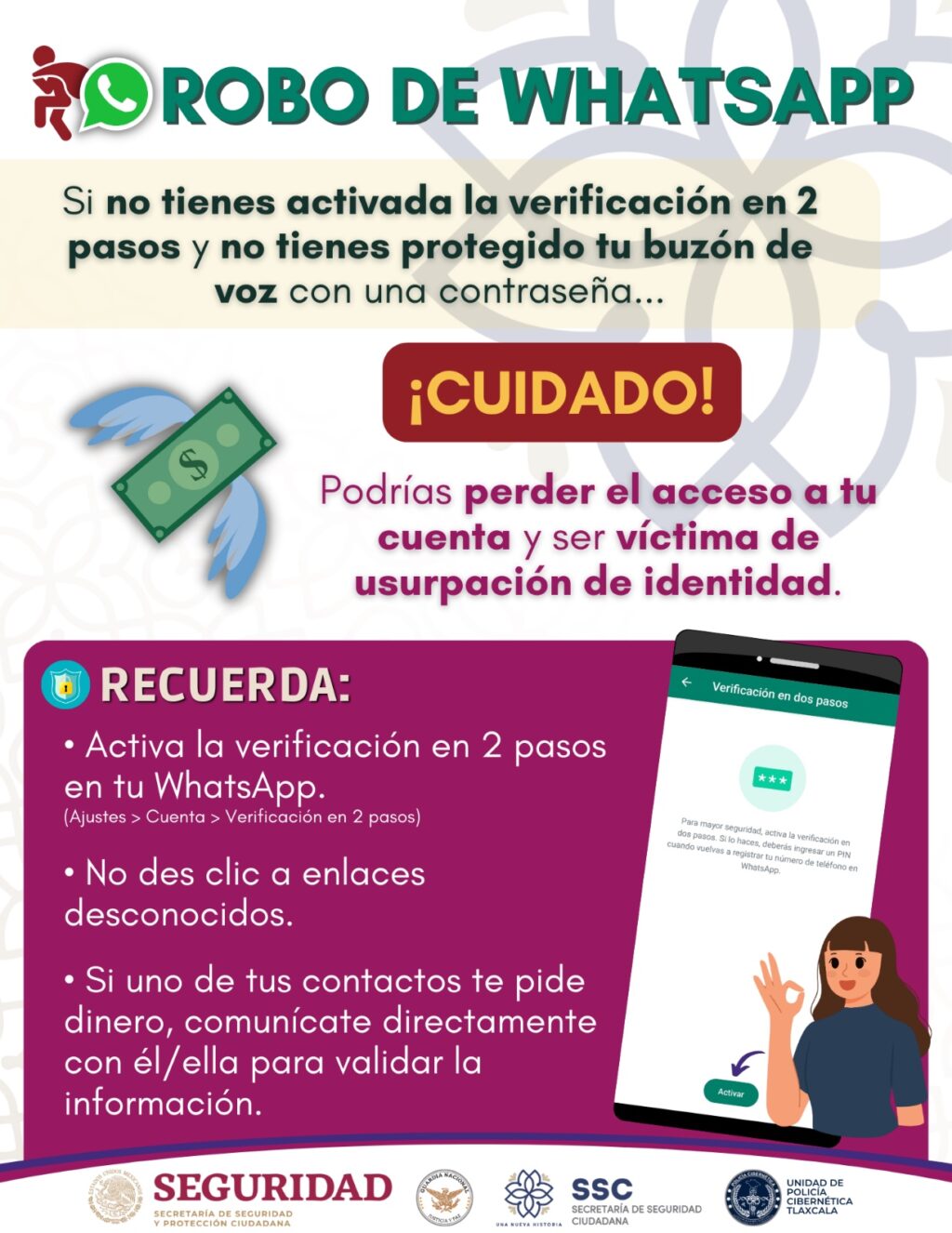 La Secretaría de Seguridad Ciudadana de Tlaxcala señala que es importante estar alerta sobre estos fraudes y reportar cualquier actividad sospechosa a las autoridades correspondientes, ya que con esto se puede reducir significativamente el riesgo de robo o hackeo de cuentas de aplicaciones de mensajería instantáneas y con ello fortalecer la privacidad y seguridad de la información personal de los usuarios.