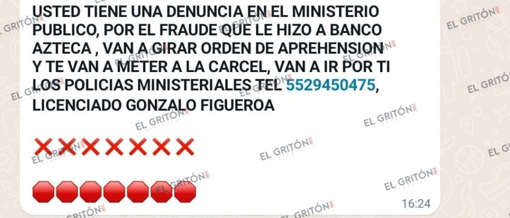 Según los denunciantes, vía WhatsApp les llega un mensaje de texto en el que se les alerta que habrá una orden de aprehensión y que la solución es llamarle a Gonzalo F., de quién se anexa el número telefónico 5529450475.