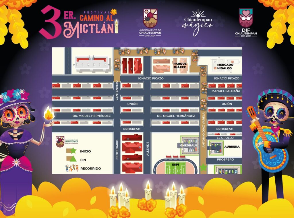 El Ayuntamiento de Chiautempan, informa sobre los cierres de calles que la Dirección de Seguridad Pública Municipal, Vialidad y Protección Civil realizará por motivo del desfile de muertos y catrinas, alusivo al Tercer Festival “Camino al Mictlán” que se celebra en el municipio.