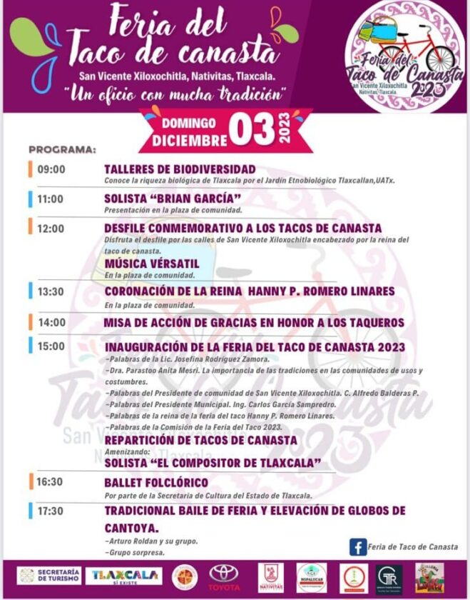 La Secretaría de Turismo del Estado (Secture) informó que está próxima la “Feria del Taco de Canasta 2023”, en colaboración con la comunidad de San Vicente Xiloxochitla, municipio de Natívitas, evento que promueve la gastronomía e impulsa la economía local.