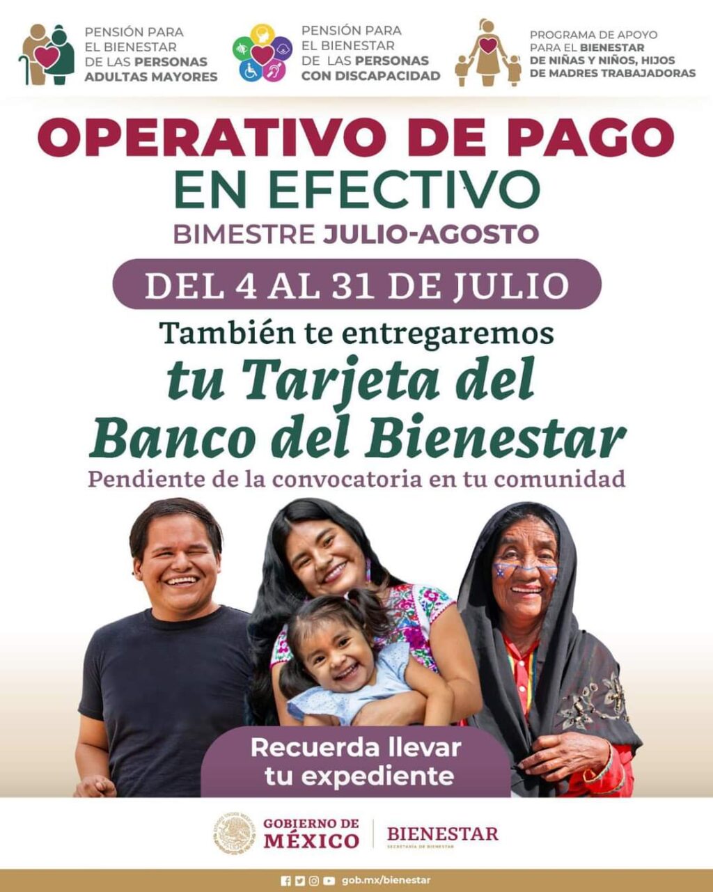El Ayuntamiento de Tlaxcala informa que el pago de pensión para adultos mayores y personas con discapacidad, que lleva a cabo la Secretaria de Bienestar del Gobierno de México, se realizará el próximo martes 25 de julio.