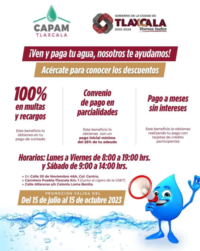 A efecto de beneficiar a usuarios de agua que se vieron afectados en su economía por la pandemia de COVID-19, la Comisión de Agua Potable y Alcantarillado del Municipio de Tlaxcala (CAPAM) aprobó un programa de beneficios a usuarios con saldo vencido, el cual deberá ser ratificado por el Cabildo.