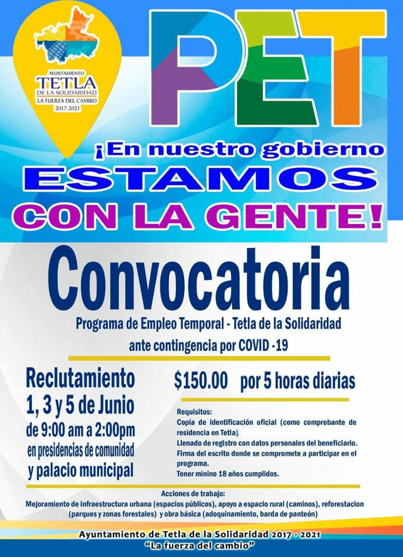 Con el fin de seguir apoyando a las familias con una fuente de ingresos, el Gobierno Municipal de Tetla de la Solidaridad que encabeza el alcalde Eleazar Molina Pérez, pondrá en marchar este lunes primero, miércoles tres y viernes cinco de junio, el reclutamiento de ciudadanos para poder accesar al Programa de Empleo Temporal por la contingencia sanitaria del COVID-19.