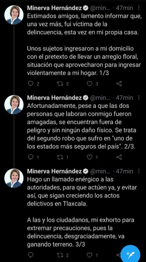 La Senadora por Tlaxcala, Minerva Hernández Ramos, fue víctima de la delincuencia por segunda ocasión, en el estado, luego de que varios sujetos armados irrumpieron en su domicilio que se ubica en Tlatempan, municipio de Apetatitlán, y hurtaron objetos de valor.
