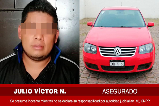 Por lo anterior, quien se identificó como Julio Víctor N., de 28 años de edad, vecino del estado de Puebla, así como la unidad Volkswagen, tipo Jetta, color rojo, fueron puestos a disposición del Agente del Ministerio Público para las indagatorias correspondientes.