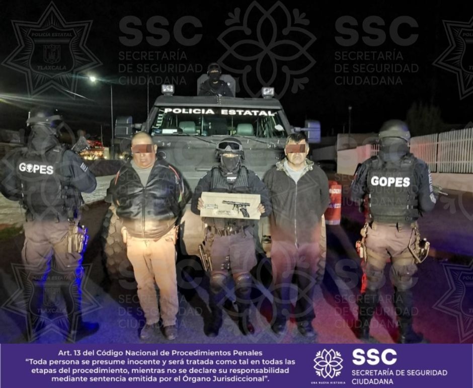 Por lo anterior, los efectivos estatales al darles alcance sobre camino San Francisco–Huamantla a la altura de una gasolinera, en la inspección les fue detectada el arma de fuego, por lo que se procedió a su aseguramiento.