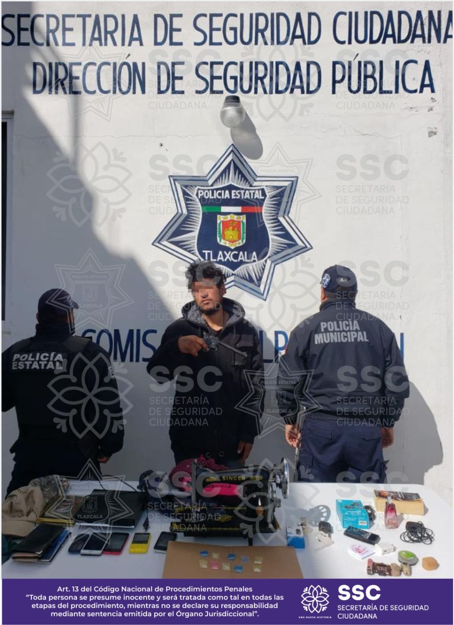 Fue asegurada una persona del sexo masculino por los delitos de portación de arma de fuego, posesión de enervantes y cohecho, por parte de elementos de la Secretaría de Seguridad Ciudadana (SSC), delegación Calpulalpan.