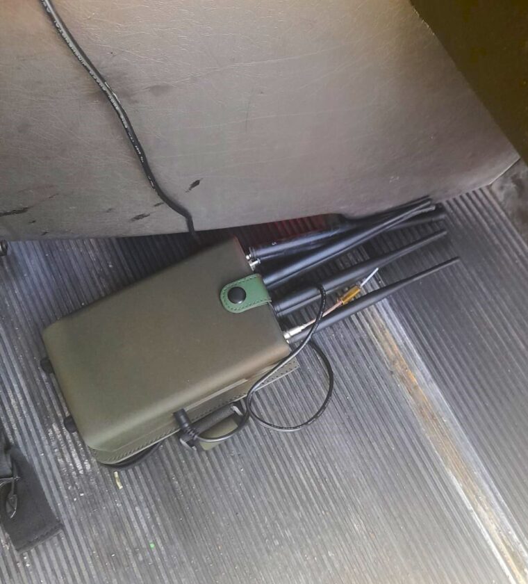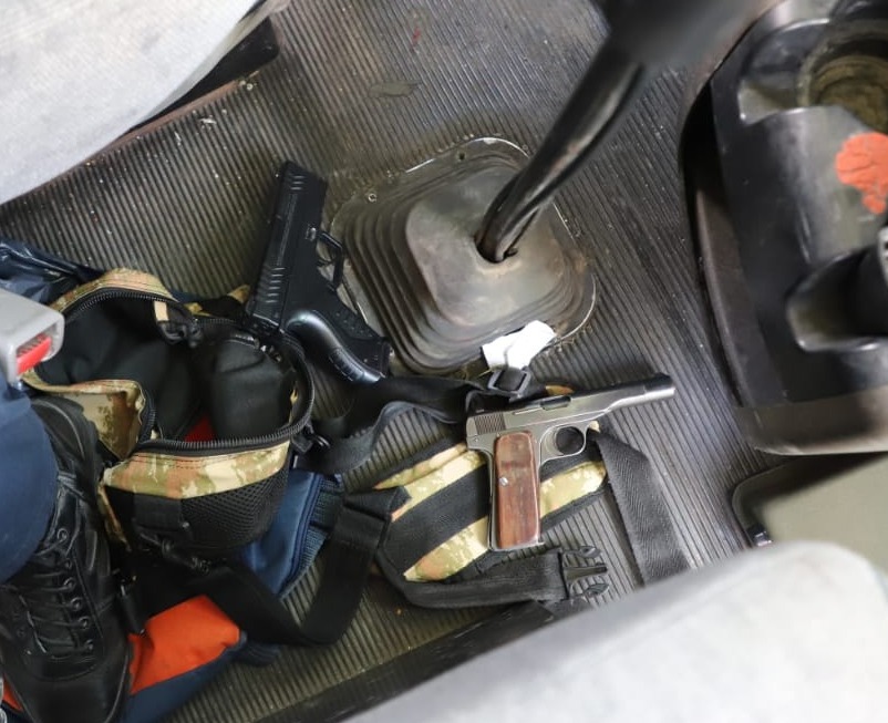 Al realizar la inspección preliminar, se detectó que los dos masculinos portaban entre sus pertenencias un arma de fuego, tipo escuadra calibre 7.65mm, abastecida con seis cartuchos útiles y un objeto óptimo para agredir, con las características propias de un arma de fuego deportiva, calibre 4.5 mm, así como un inhibidor de señal para desactivar el GPS del camión.