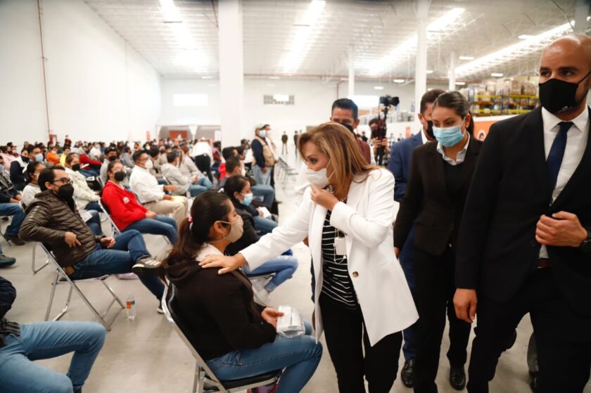 La gobernadora Lorena Cuéllar Cisneros presenció la aplicación de la vacuna contra Covid-19 a personal del Nodo Industrial de Huamantla, como parte de la estrategia que implementó la Secretaría de Bienestar en coordinación con el Gobierno del Estado a través de las Brigadas Correcaminos, a fin de disminuir contagios.