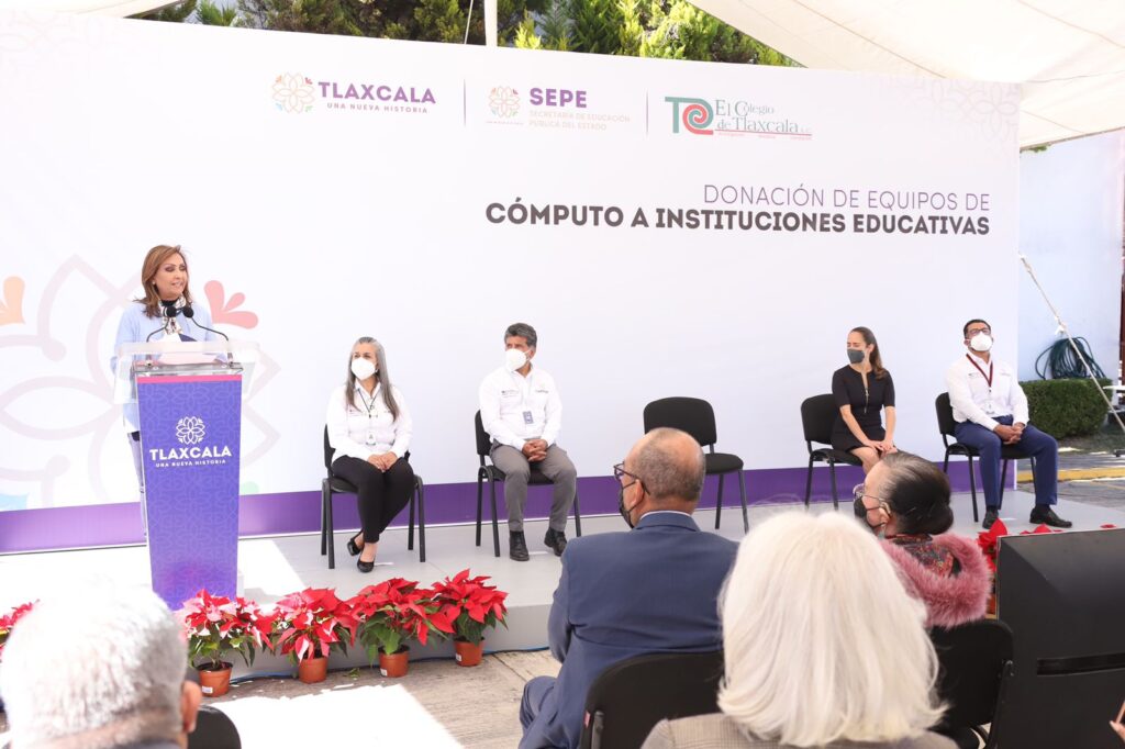 La gobernadora Lorena Cuéllar Cisneros atestiguó el acto de donación de equipos de cómputo por parte de El Colegio de Tlaxcala (Coltlax) a escuelas de nivel básico y medio superior, a fin de dotar a los estudiantes de herramientas tecnológicas que ayuden a su desempeño académico.