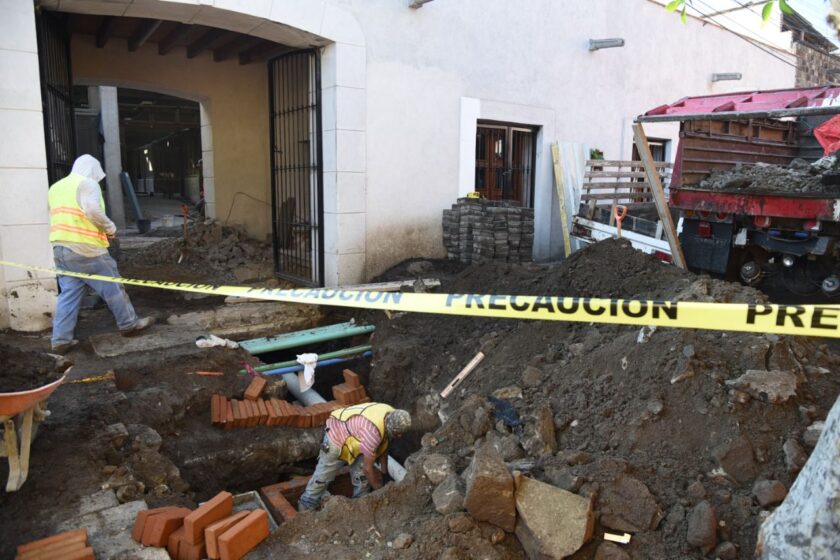 Esta mañana trabajadores conectan el drenaje del próximo mercado de artesanos a la red pública de la calle Xicohténcatl, en el Centro de la Ciudad de Tlaxcala.