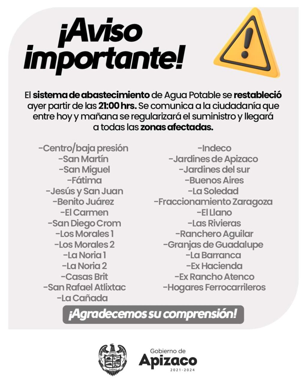 El sistema de abastecimiento de Agua Potable se restableció ayer partir de las 21:00 hrs. Se comunica a la ciudadanía que entre hoy y mañana se regularizará el suministro y llegará a todas las zonas afectadas.