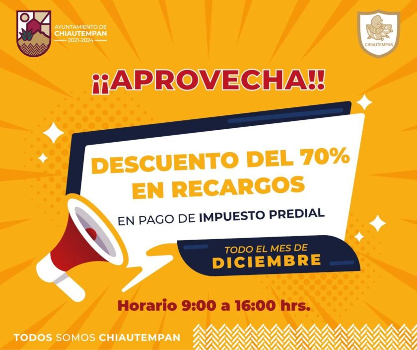 El Ayuntamiento de Chiautempan a través de la Tesorería Municipal anuncia campañas de descuento en pago predial anticipado y mantenimiento del panteón, a fin de evitar multas, recargos y ponerse al corriente.