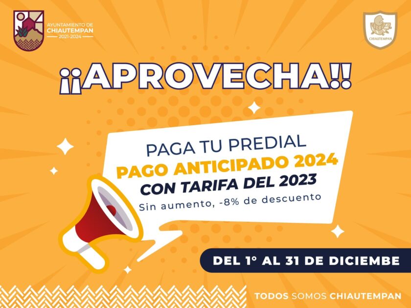 La primera es para las y los ciudadanos que se encuentren al corriente de su pago de predial, por lo que, el Ayuntamiento chiautempense invita a realizar el pago anticipado 2024, manteniendo la tarifa de 2023 (sin aumento) y con el ocho por ciento de descuento.