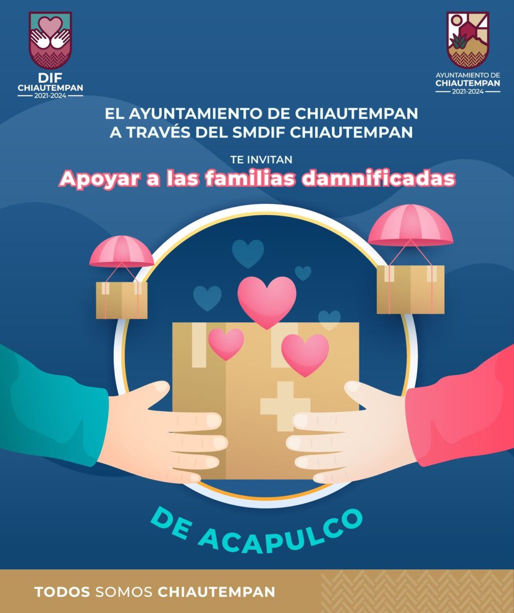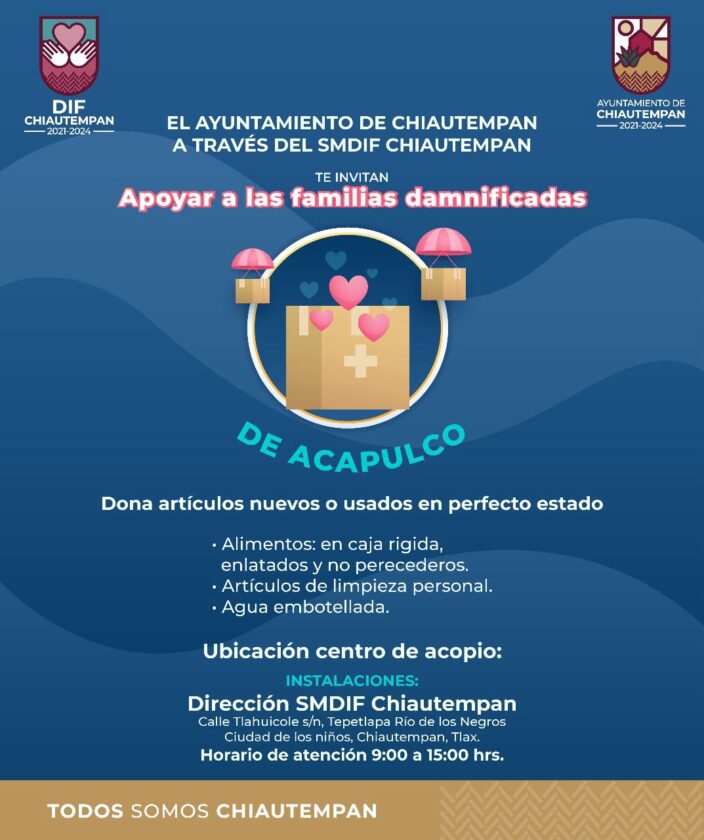 El Ayuntamiento de Chiautempan y el Sistema Municipal para el Desarrollo Integral de la Familia (SMDIF) invitan a la ciudadanía en general a apoyar a las familias damnificadas de Acapulco.
