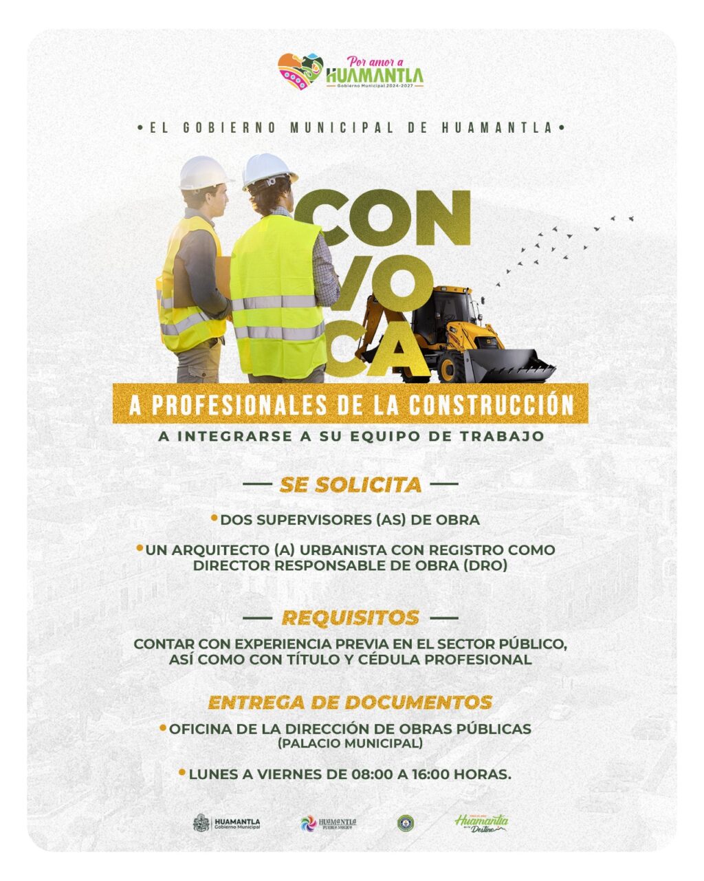 El Gobierno Municipal de Huamantla, a través de la Dirección de Obras Públicas y Desarrollo Urbano, invita a profesionales de la construcción a integrarse a su equipo de trabajo, con el objetivo de fortalecer la labor institucional en este importante sector.