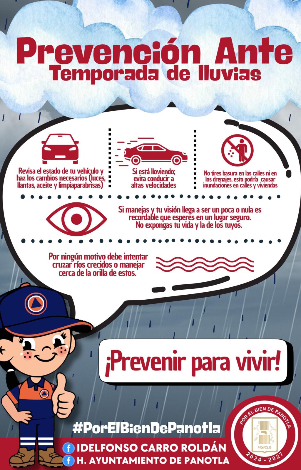 El H. Ayuntamiento de Panotla, encabezado por el presidente municipal Idelfonso Carro Roldán, informa a la ciudadanía sobre las medidas preventivas a tomar ante la presente temporada de lluvias, con el objetivo de salvaguardar la integridad de las familias y reducir riesgos en viviendas, vialidades y zonas vulnerables del municipio.