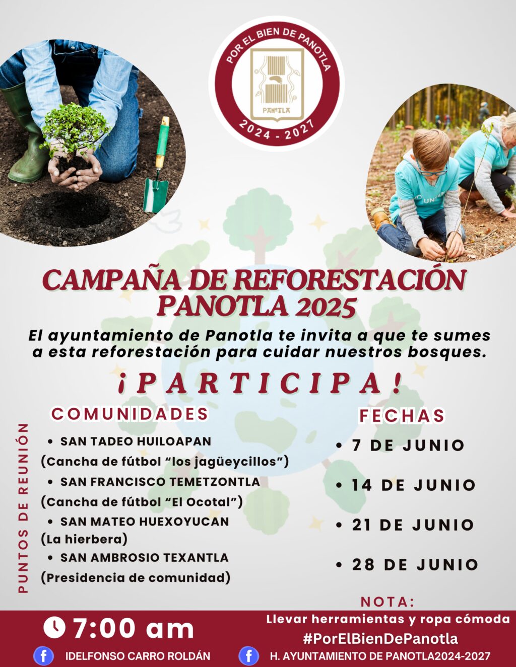 Con el firme compromiso de preservar los recursos naturales y fomentar la participación ciudadana en acciones ambientales, el H. Ayuntamiento de Panotla 2024–2027, encabezado por el presidente municipal Idelfonso Carro Roldán, invita a la población a sumarse a la Campaña de Reforestación Panotla 2025.