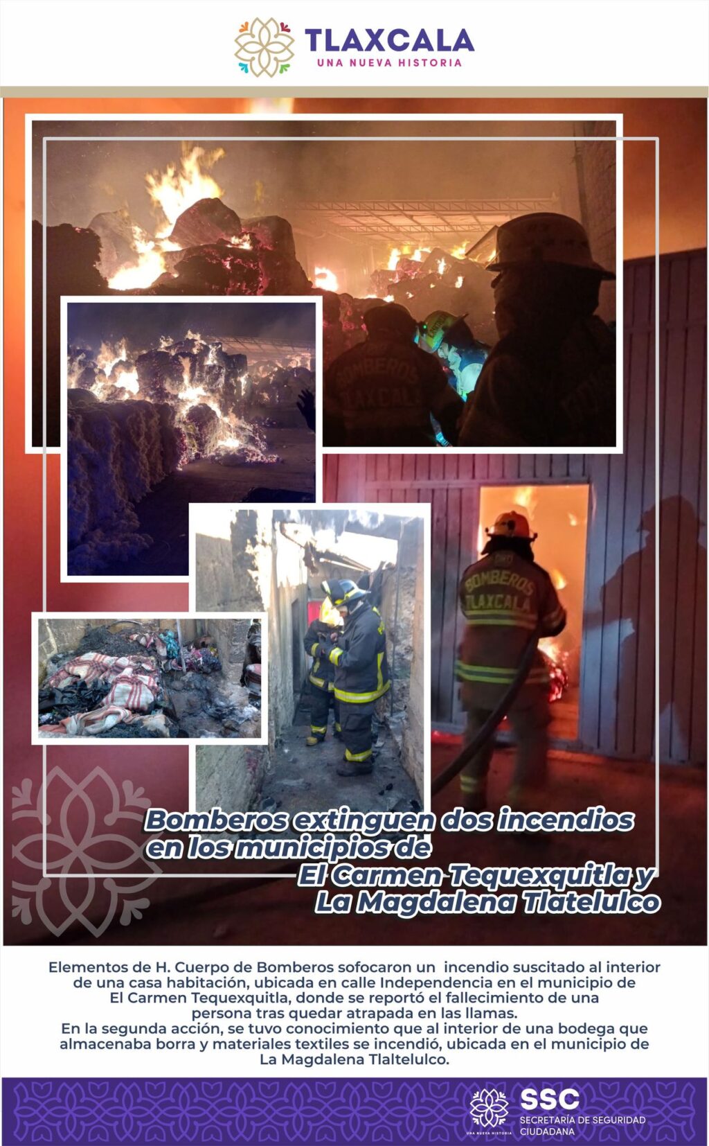 La Secretaría de Seguridad Ciudadana (SSC), través del Heroico Cuerpo de Bomberos, atendió de manera inmediata las alertas emitidas por el Servicio de Emergencias 911, sobre dos incendios ocurridos en El Carmen Tequexquitla y La Magdalena Tlaltelulco.