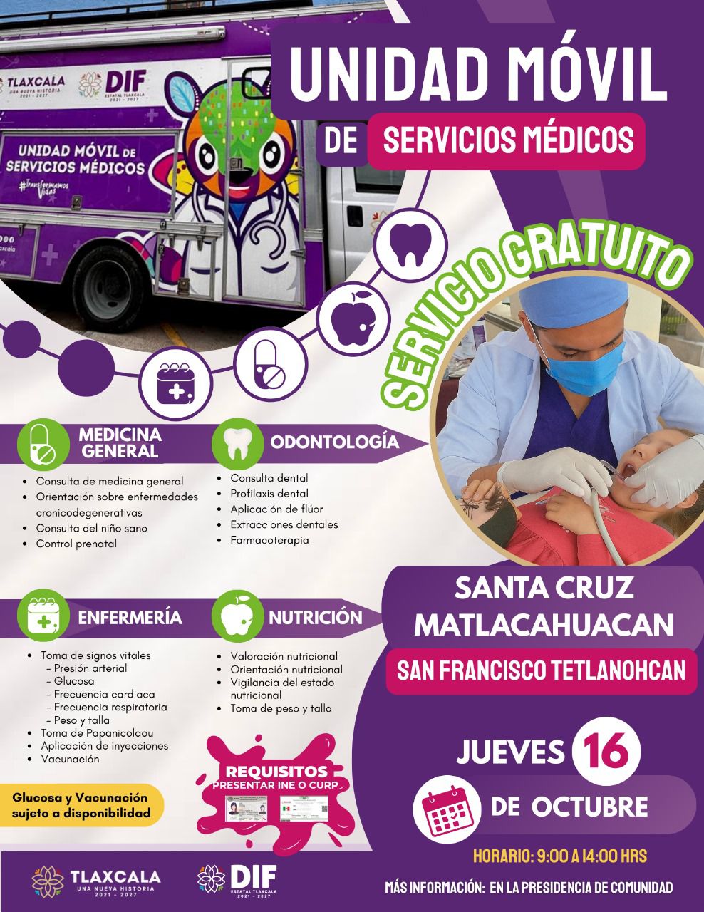 El Sistema Municipal para el Desarrollo Integral de la Familia (SMDIF) de San Francisco Tetlanohcan, que encabeza la presidenta honorífica Kritsbey Pérez Flores, en coordinación con el DIF Estatal Tlaxcala, informa que este jueves 16 de octubre se llevará a cabo una jornada médica gratuita en la comunidad de Santa Cruz Matlacahuacan.