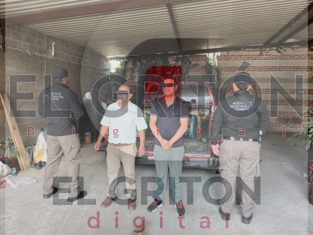 En el lugar fueron detenidos Juan N., de 60 años, y Braulio N., de 32 años, identificados como padre e hijo, conocidos con los alias de “El Pemex” y “El Pemex JR”, quienes presuntamente estarían vinculados con actividades de almacenamiento y distribución ilegal de combustible.