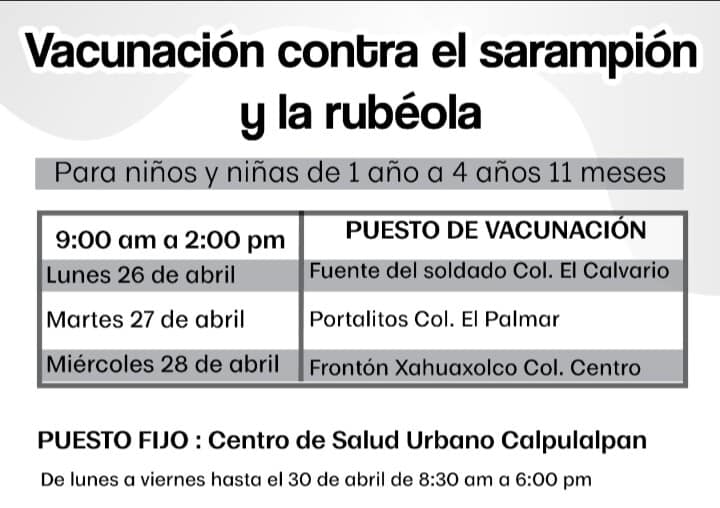 Campaña de seguimiento de vacunación con la vacuna doble viral contra el sarampión y la rubéola (SR) en niños y niñas de 1 a 4 años de edad en Calpulalpan