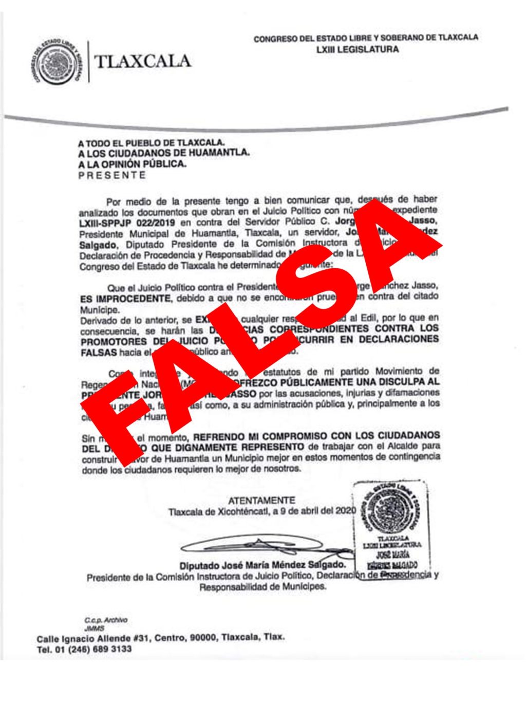 El Congreso del Estado de Tlaxcala aclaró que es falso el oficio que circula en redes sociales, en el que se refiere que el Diputado Presidente de la Comisión Instructora de Juicio Político, Declaración de Procedencia, Desafuero y Responsabilidad de Munícipes, José María Méndez Salgado, declara la improcedencia del juicio político en contra del alcalde de Huamantla, Jorge Sánchez Jasso, lo exime de responsabilidad política y ofrece una disculpa pública.