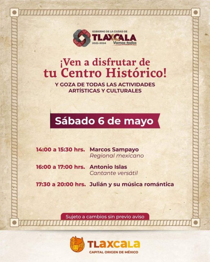 Las actividades comienzan este sábado 6 de mayo, a las 14:00 horas, con música regional mexicana interpretada por Marcos Sampayo; a las 16:00 horas actuará Antonio Islas y a partir de las 17:30 horas tendremos la presentación de Julián y su música romántica.