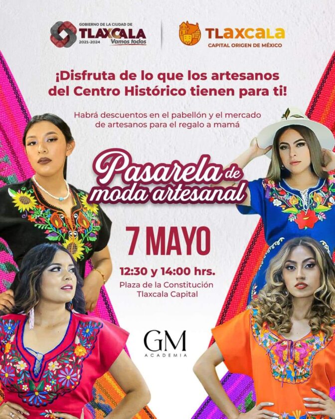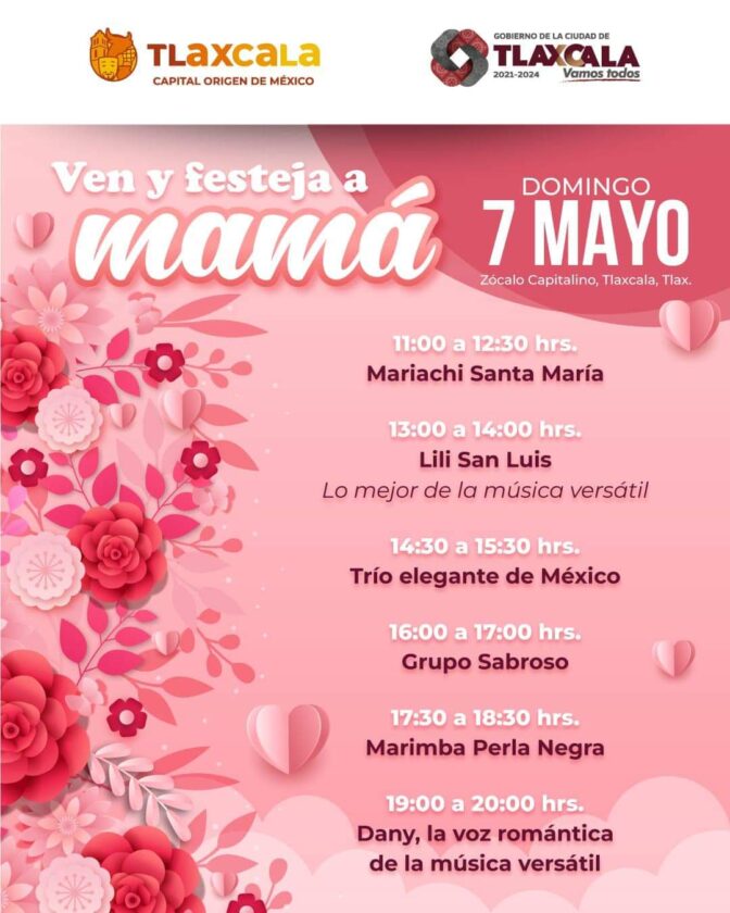 El domingo 7 de mayo, a las 11:00 horas, inicia la actividad dedicada a las mamás, con el mariachi Santa María; a las 12:30 horas veremos la primera parte de una pasarela de moda artesanal a cargo de modelos Academia GM de Tlaxcala; a las 13:00 horas Lili San Luis con música versátil y terminando su actuación, la segunda parte de la pasarela.