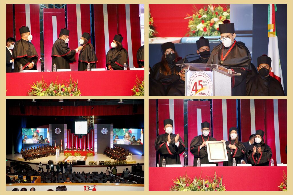 El Dr. Luis González subrayó que, la COVID-19, nos alejó de los campus y nos arrojó al mundo virtual, al que recién hemos comenzado a comprender, por lo que, nuestra institución, debe consolidar esa dimensión, aprender de ese entorno y transformarse al ritmo que ello exige, y estar lista para brindar nuevas carreras que la realidad demanda y que los jóvenes requieren para hacerle frente a los nuevos retos: “a 45 años, emprendemos el camino para que la Autónoma de Tlaxcala sea siempre una universidad solidaria, una universidad humanista y una universidad de y para el siglo XXI”, sentenció.
