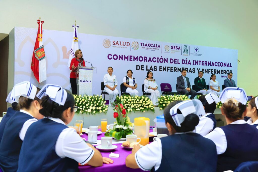 La gobernadora Lorena Cuéllar Cisneros encabezó la conmemoración del Día Internacional de las Enfermeras y los Enfermeros, a quienes reconoció por su labor humanista, vocación de servicio y profesionalismo al momento de brindar atención médica a la población tlaxcalteca.