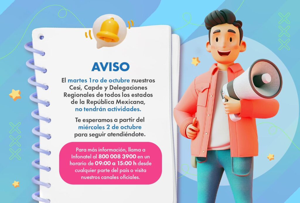 El Instituto del Fondo Nacional de la Vivienda para los Trabajadores (Infonavit) suspenderá el martes 1 de octubre las actividades en sus Centros de Servicio de todo el país, en cumplimiento con el decreto oficial emitido con motivo de la toma de posesión presidencial.
