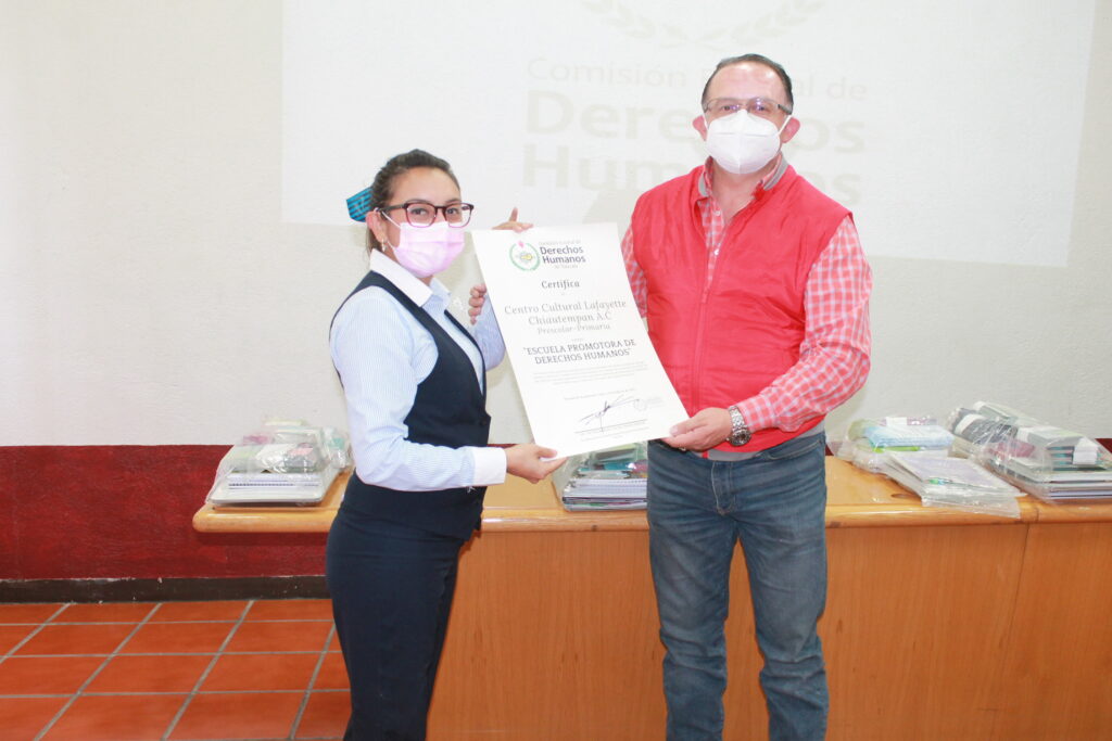 Como parte de las acciones que la CEDH realiza para garantizar la capacitación, promoción y divulgación de los Derechos Humanos, el Presidente del Organismo Autónomo, Víctor Manuel Cid del Prado Pineda y la Dirección de Programas, entregó el título al Profesor Jaime Acoltzi Meléndez, Directivo de la Escuela Primaria “Centro Escolar”, a la Maestra Araceli Trejo Padilla, Directora de la Escuela Secundaria General “Valentín Gómez Farías” y a la Maestra, Sarahi García Reyna, Directora del Centro Cultural Lafayette.