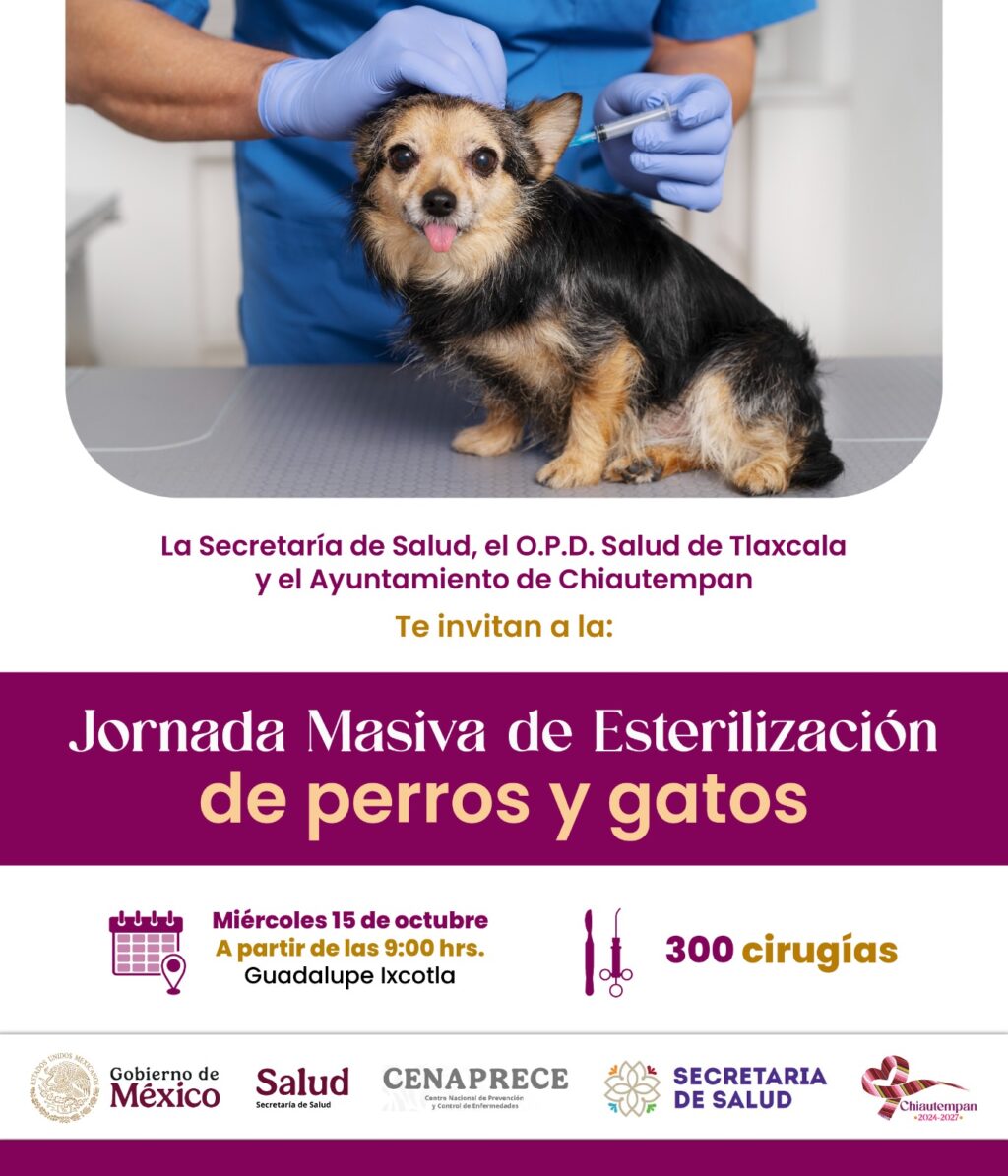 En el marco del 4º Taller Nacional de Esterilización Quirúrgica de Perros y Gatos, organizado por la Secretaría de Salud del Gobierno de México y el O.P.D. Salud de Tlaxcala, en coordinación con el Ayuntamiento de Chiautempan, se llevará a cabo una jornada masiva de esterilización gratuita en esta demarcación.