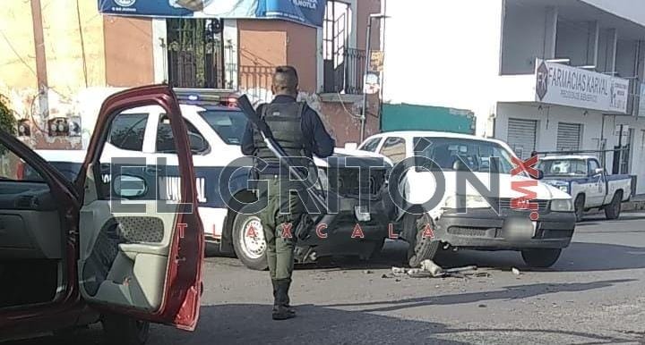 El choque entre una unidad oficial de la Dirección de Seguridad Pública Municipal de Panotla y un vehículo de la marca Volkswagen, tipo Pointer, la mañana de este lunes, dejó como saldo cuantiosos daños materiales, en la avenida Benito Juárez esquina con Emiliano Zapata en la zona centro de la comuna.