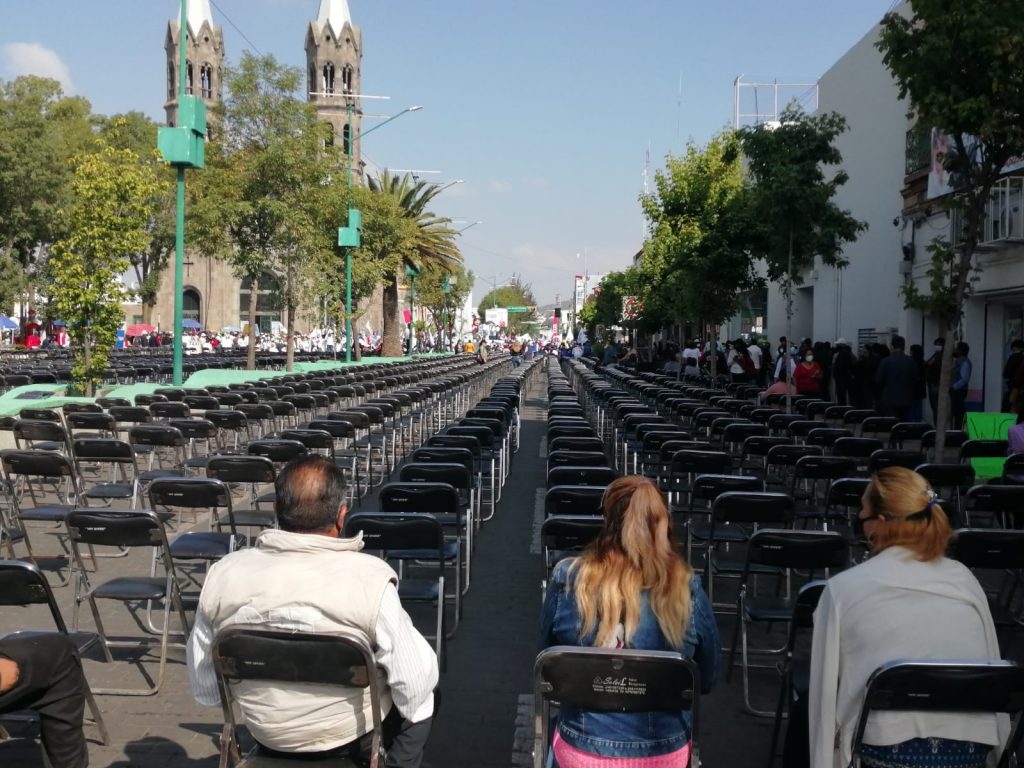La cita para todos los acarreados e invitados obligatoriamente a fuerza era a las 9:00 am, en Apizaco pero son poco más de las 10: 00 y cientos de sillas se encuentran vacías.