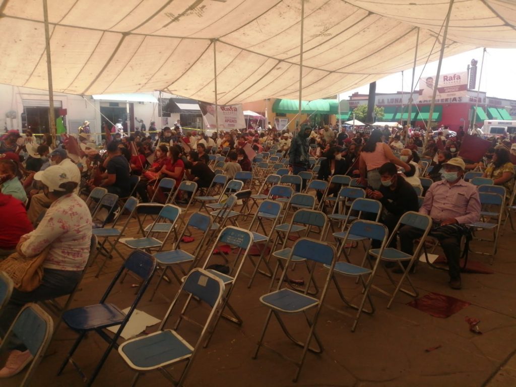 El cierre de campaña de Rafael Alvarez Escarcega, candidato a la presidencia de Apizaco por Morena, colapsó al no llegar ni a la mitad de su objetivo, pues se vieron sillas vacías en su cierre de campaña.