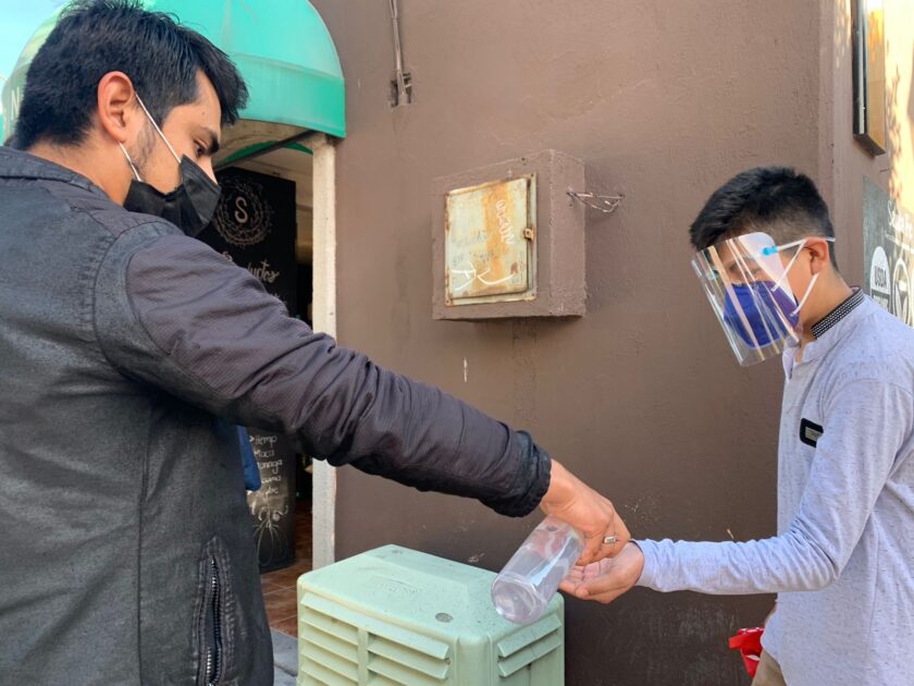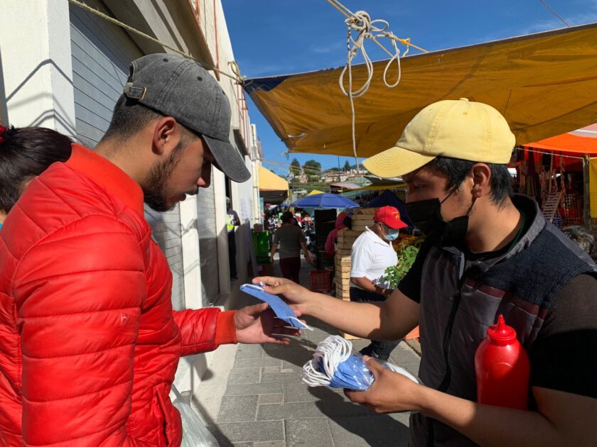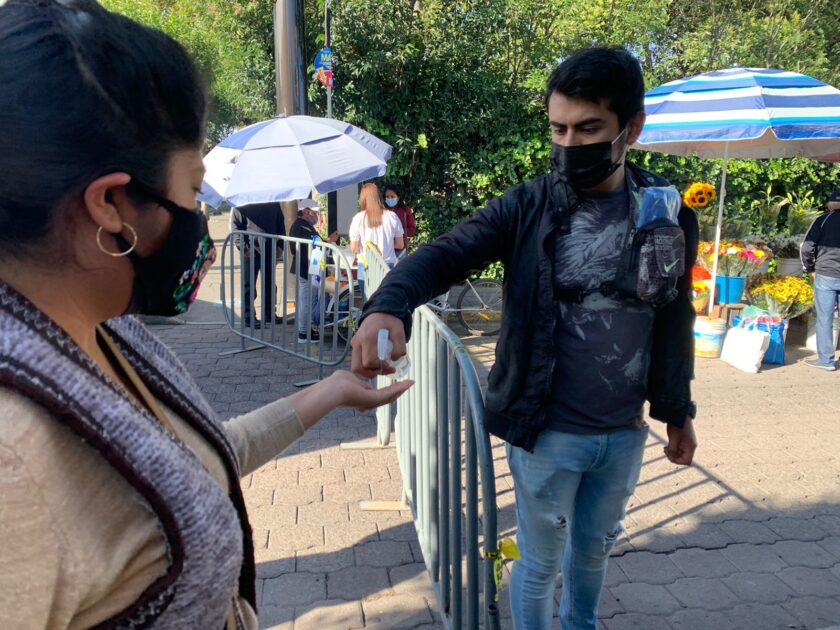 En los accesos al mercado municipal “Emilio Sánchez Piedras” y del tianguis sabatino trabajadoras y trabajadores del municipio reparten cubrebocas, gel alcohol y rocían con una solución desinfectante.
