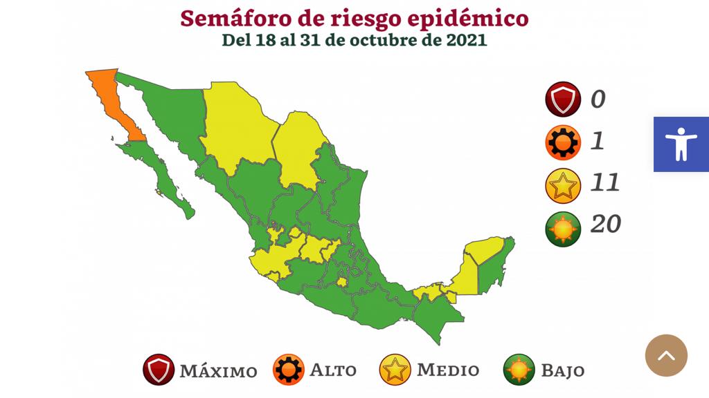 De acuerdo con el semáforo epidemiológico de riesgo Covid-19, sólo el estado de Baja California se encuentra en color naranja; así como 11 entidades en color amarillo donde se ubican Chihuahua, Tabasco, Yucatán, Querétaro, Morelos, Guanajuato, Jalisco, Colima, Coahuila, Campeche y Aguascalientes.