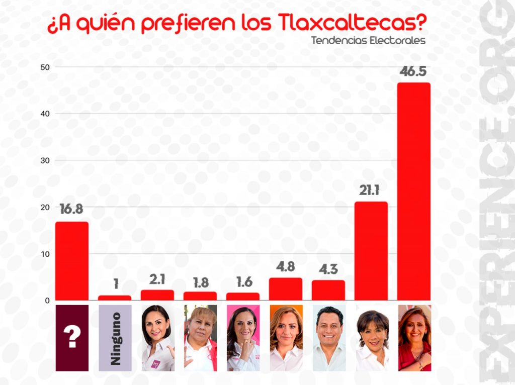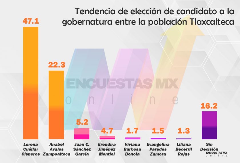 De acuerdo con otro estudio demoscópico, Lorena Cuéllar con el 47.1 por ciento; Anabell Ávalos con el 22.3 por ciento; le sigue Juan Sánchez con el 5.2% y Eréndira Jiménez con 4.7 por ciento; estos resultados se aprecian en la encuesta MxOnline En tanto, Experience.org da los siguientes resultados: Lorena tiene el 46.5 por ciento; la priísta 21.1 por ciento; la abanderada del Movimiento Ciudadano (MC) el 4.8 por ciento, y el de Redes el 4.3.